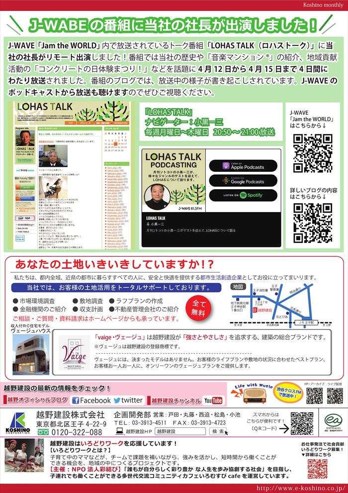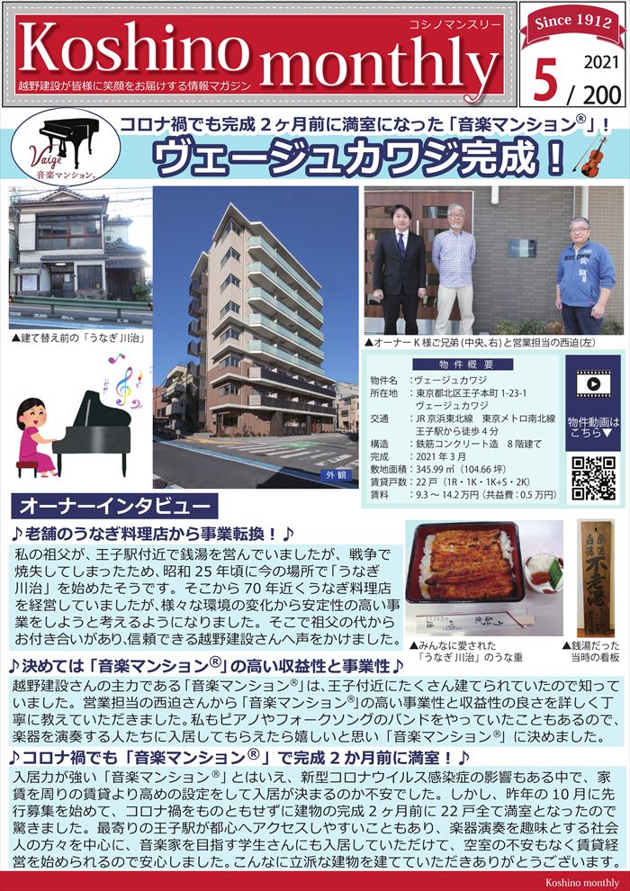 『Koshino monthly 5月号』コロナ禍でも完成2ヶ月前に満室になった「音楽マンション®」!「ヴェージュカワジ」完成!