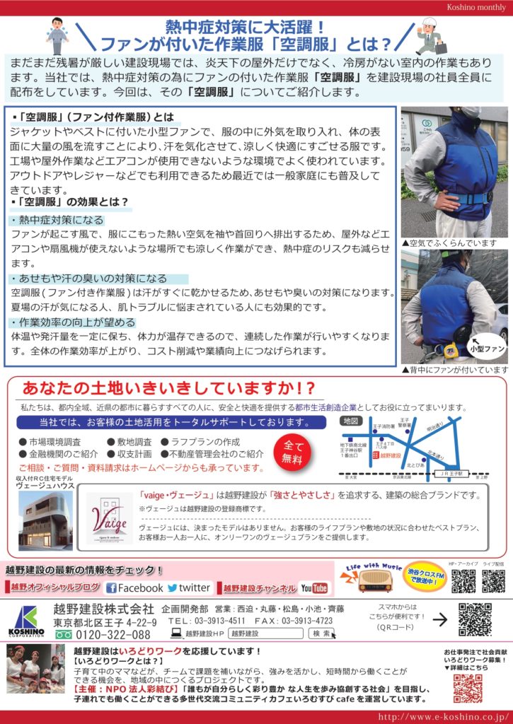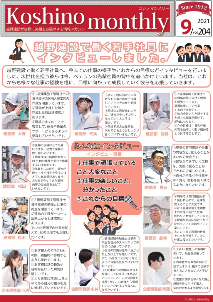 『Koshino monthly 9月号』越野建設で働く若手社員にインタビューをしました。 越野マンスリー 2021.10.05 2021.09.30 『Koshino monthly(越野マンスリー)』は越野建設の最新情報や、建築に関するお役立ち情報などをお客様にお届けする情報紙です。 【今月の記事】 ・越野建設で働く若手社員にインタビューをしました。 ・熱中症対策に大活躍!ファンが付いた作業服「空調服」とは?