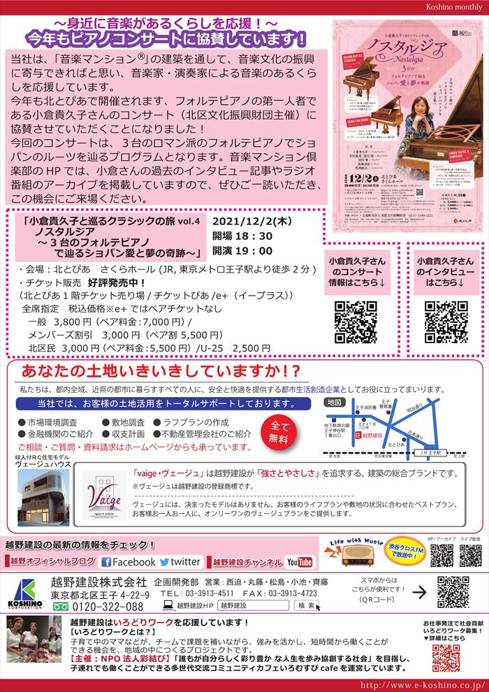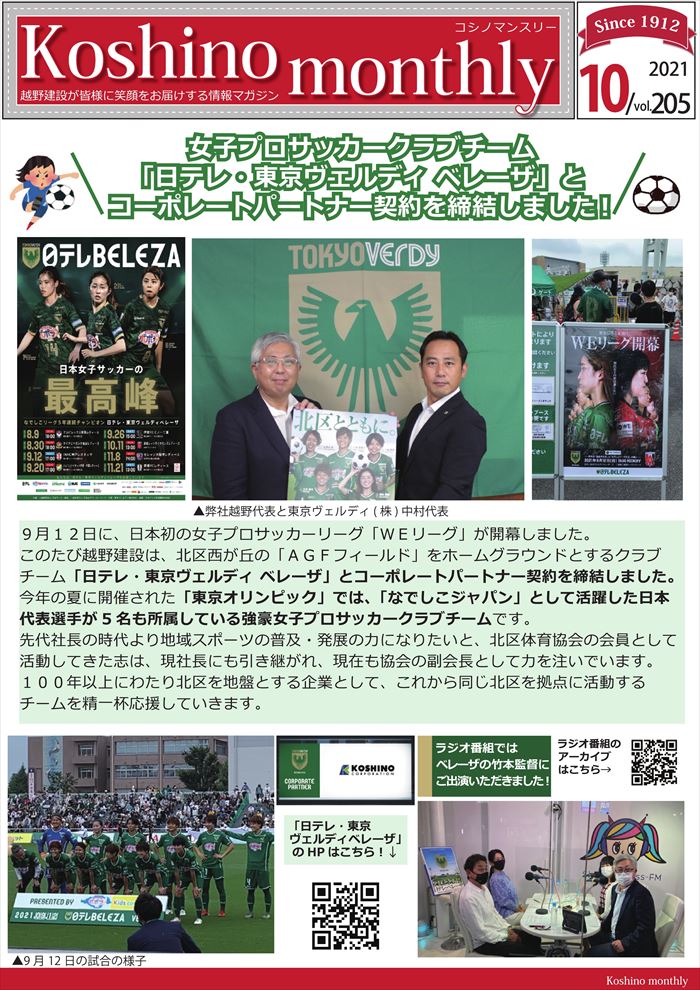 『Koshino monthly 10月号』女子プロサッカークラブチーム「日テレ・東京ヴェルディ ベレーザ」とコーポレートパートナー契約を締結しました! 越野マンスリー 2021.10.25 『Koshino monthly(越野マンスリー)』は越野建設の最新情報や、建築に関するお役立ち情報などをお客様にお届けする情報紙です。 【今月の記事】 ・女子プロサッカークラブチーム「日テレ・東京ヴェルディ ベレーザ」とコーポレートパートナー契約を締結しました! ・身近に音楽があるくらしを応援!今年もピアノコンサートに協賛しています!