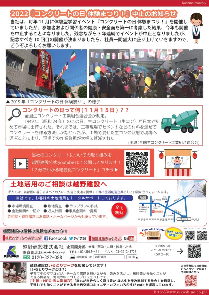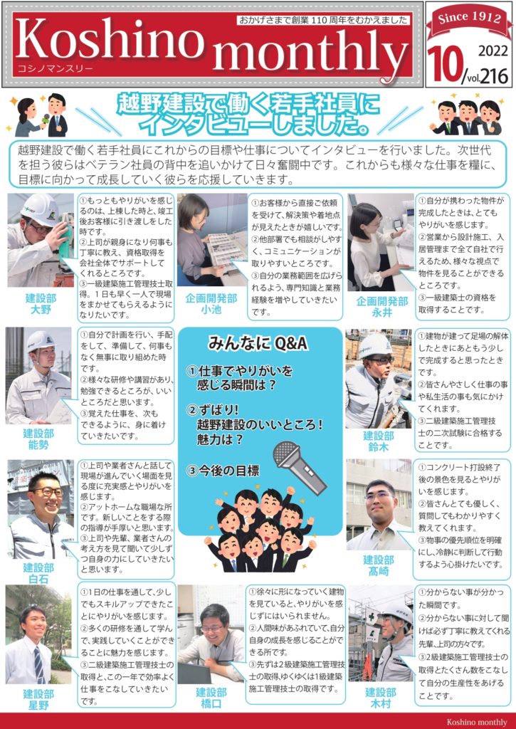 『Koshino monthly 10月号』越野建設で働く若手社員にインタビューしました。 越野マンスリー 2022.10.15 『Koshino monthly(越野マンスリー)』は越野建設の最新情報や、建築に関するお役立ち情報などをお客様にお届けする情報紙です。 【今月の記事】 ・越野建設で働く若手社員にインタビューしました。 ・2022『コンクリートの日 体験まつり!』中止のおしらせ