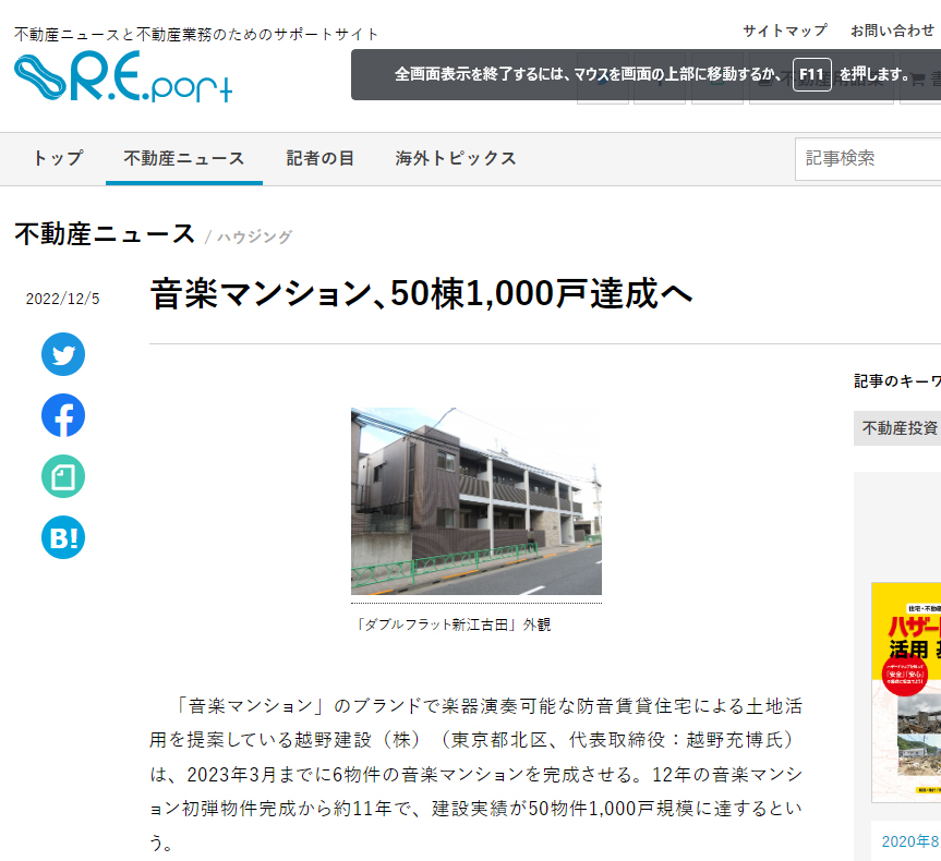 音楽マンション、50棟1,000戸達成へ | 最新不動産ニュースサイト「R.E.port」 (re-port.net) 未分類 2022.12.06 最新不動産ニュースサイト「R.E.port」に、「音楽マンション」の取材記事が掲載されました。 ぜひ下記よりご一読ください。 音楽マンション、50棟1,000戸達成へ | 最新不動産ニュースサイト「R.E.port」 (re-port.net)