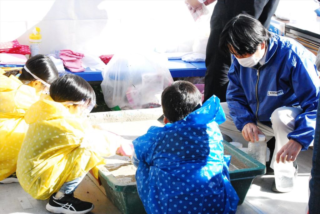 目の前で材料を調合し絞り出されるセメントに皆さん興味深げでした。今年もセメント協会研究所さんから材料の提供など、ご協力をいただきました。