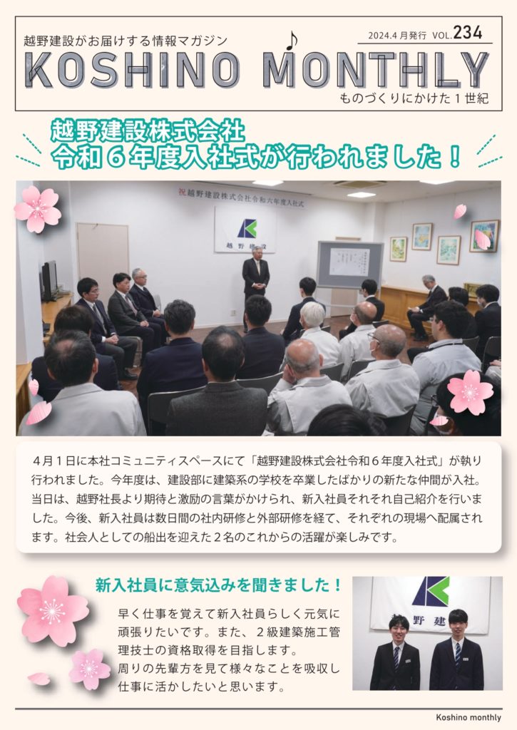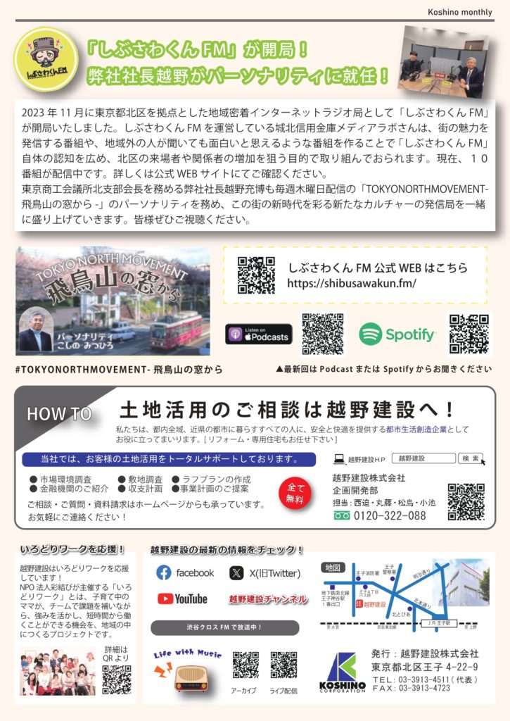 『Koshino monthly 4月号』越野建設株式会社令和6年度入社式が行われました! 越野マンスリー 2024.04.16 『Koshino monthly(越野マンスリー)』は越野建設の最新情報や、建築に関するお役立ち情報などをお客様にお届けする情報紙です。 【今月の記事】 ・越野建設株式会社令和6年度入社式が行われました! ・「しぶさわくんFM」開局!弊社社長越野がパーソナリティに就任!