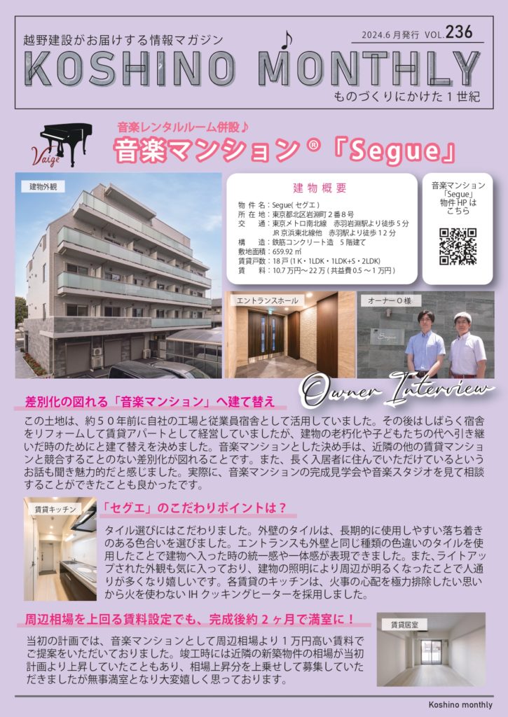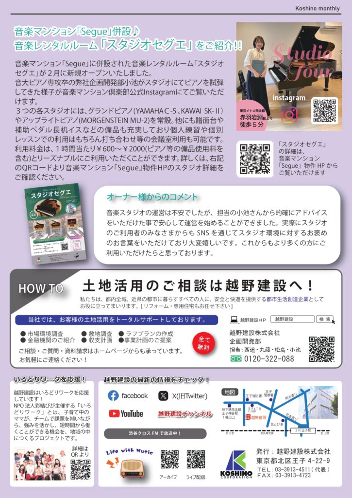 『Koshino monthly 6月号』音楽レンタルルーム併設♪音楽マンション®「Segue」 越野マンスリー 2024.06.15 『Koshino monthly(越野マンスリー)』は越野建設の最新情報や、建築に関するお役立ち情報などをお客様にお届けする情報紙です。 【今月の記事】 ・音楽レンタルルーム併設♪音楽マンション®「Segue」 ・音楽マンション「Segue」併設 音楽レンタルルーム「スタジオセグエ」をご紹介!!