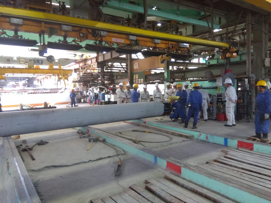 工場での当該杭の製作工程は、PC鋼材切断→鉄筋かご組→端部金具取付け→型枠組み込み→コンクリート投入→かご筋緊張→遠心力締固め→一次養生→脱型→製品中間検査→二次養生→品質検査試験→付属品溶接→出荷 となりますが、上記一連の流れについて説明を受けながら製造ライン見学しました。