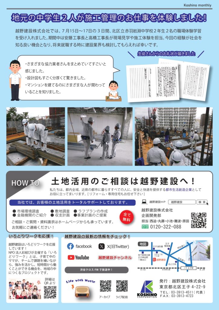 『Koshino monthly 7-8月号』女子プロサッカークラブチーム日テレ・東京ヴェルディベレーザとコーポレートパートナー契約を更新! 越野マンスリー 2025.08.18 『Koshino monthly(越野マンスリー)』は越野建設の最新情報や、建築に関するお役立ち情報などをお客様にお届けする情報紙です。 【今月の記事】 ・女子プロサッカークラブチーム日テレ・東京ヴェルディベレーザとコーポレートパートナー契約を更新! ・楠瀬直木新監督が渋谷クロスFMにゲスト出演! ・地元の中学生2人が施工管理のお仕事を体験しました!
