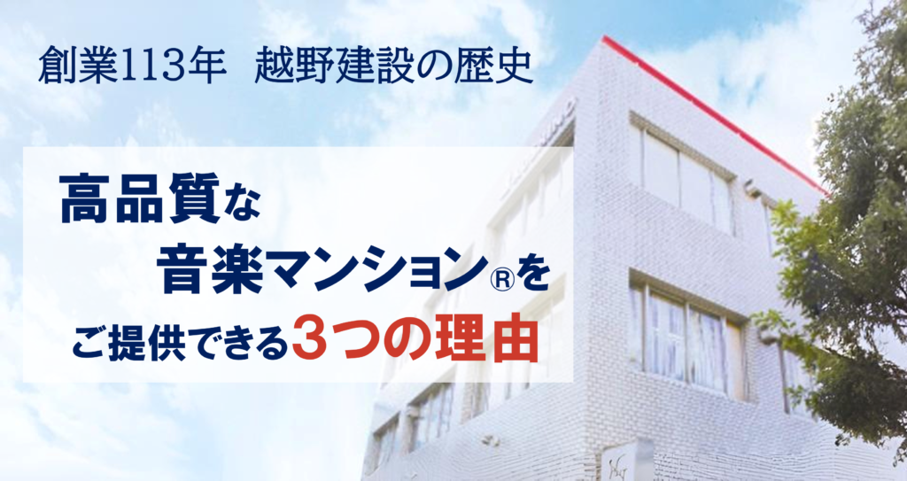 ▼「創業113年」越野建設の歴史 高品質な音楽マンション®をご提供できる3つの理由