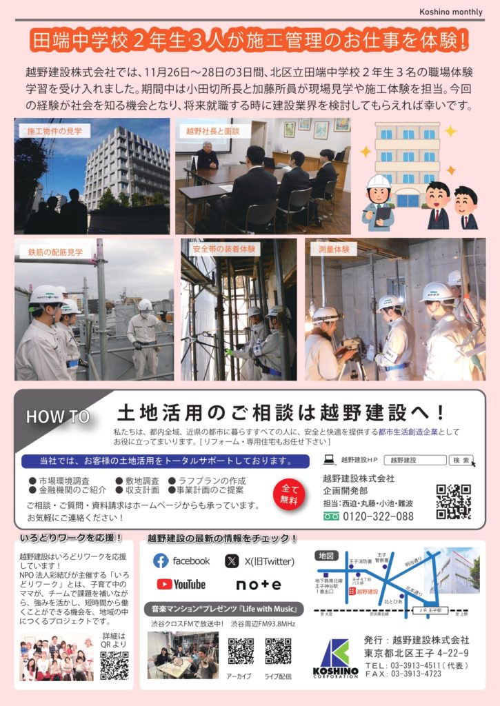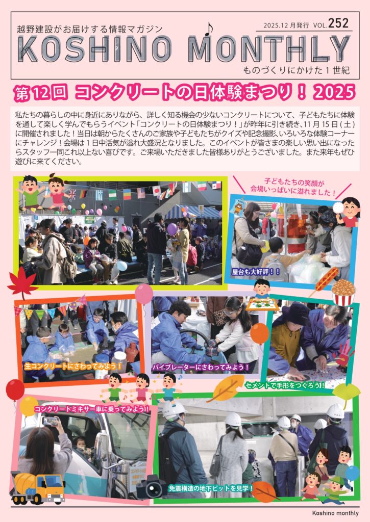 『Koshino monthly 12月号』第12回コンクリートの日体験まつり!2025 越野マンスリー 2025.12.17 『Koshino monthly(越野マンスリー)』は越野建設の最新情報や、建築に関するお役立ち情報などをお客様にお届けする情報紙です。 【今月の記事】 ・第12回コンクリートの日体験まつり!2025 ・田端中学校2年生3人が施工管理のお仕事を体験!