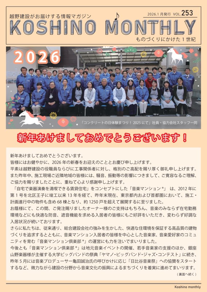『Koshino monthly 1月号』 弊社代表取締役 越野充博より、新年の御挨拶を申し上げます。 越野マンスリー 2026.01.01 『Koshino monthly(越野マンスリー)』は越野建設の最新情報や、建築に関するお役立ち情報などをお客様にお届けする情報紙です。 【今月の記事】 ・ 弊社代表取締役 越野充博より、新年の御挨拶を申し上げます。