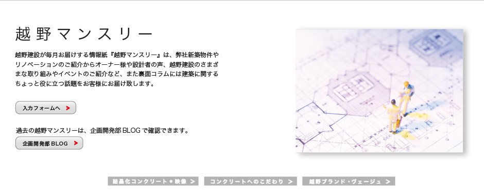 越野建設が毎月お届けする情報紙『コシノマンスリー』は、弊社新築物件やリノベーションのご紹介からオーナー様や設計者の声、越野建設のさまざまな取り組みやイベントのご紹介など、また裏面コラムには建築に関するちょっと役に立つ話題をお客様にお届け致します。