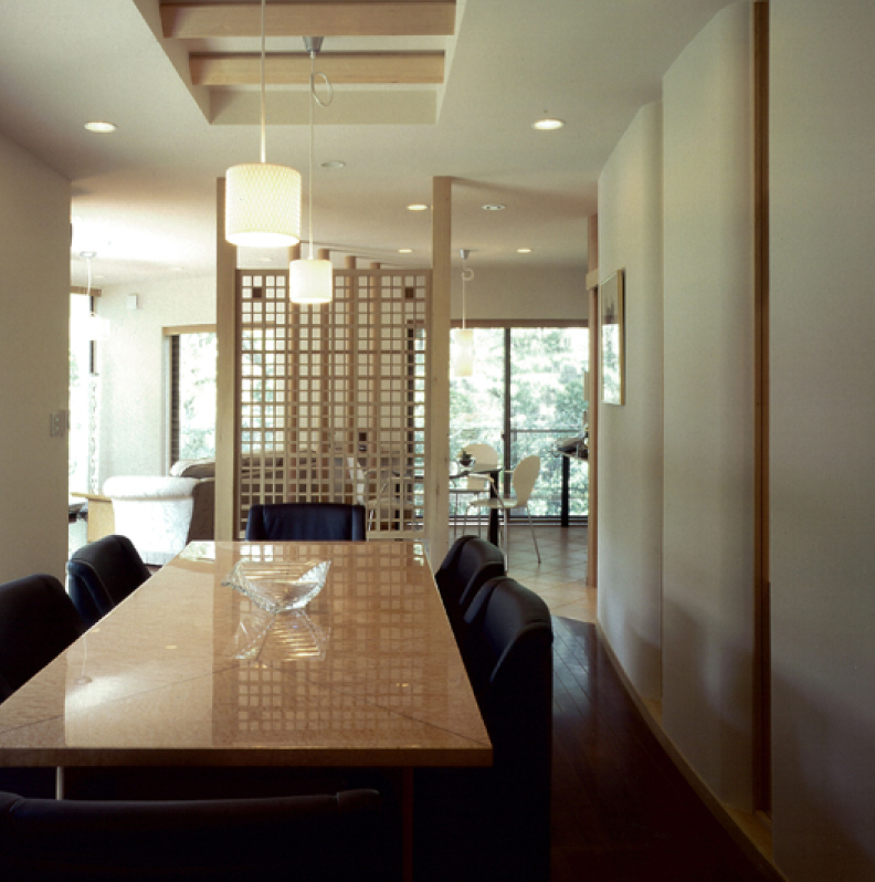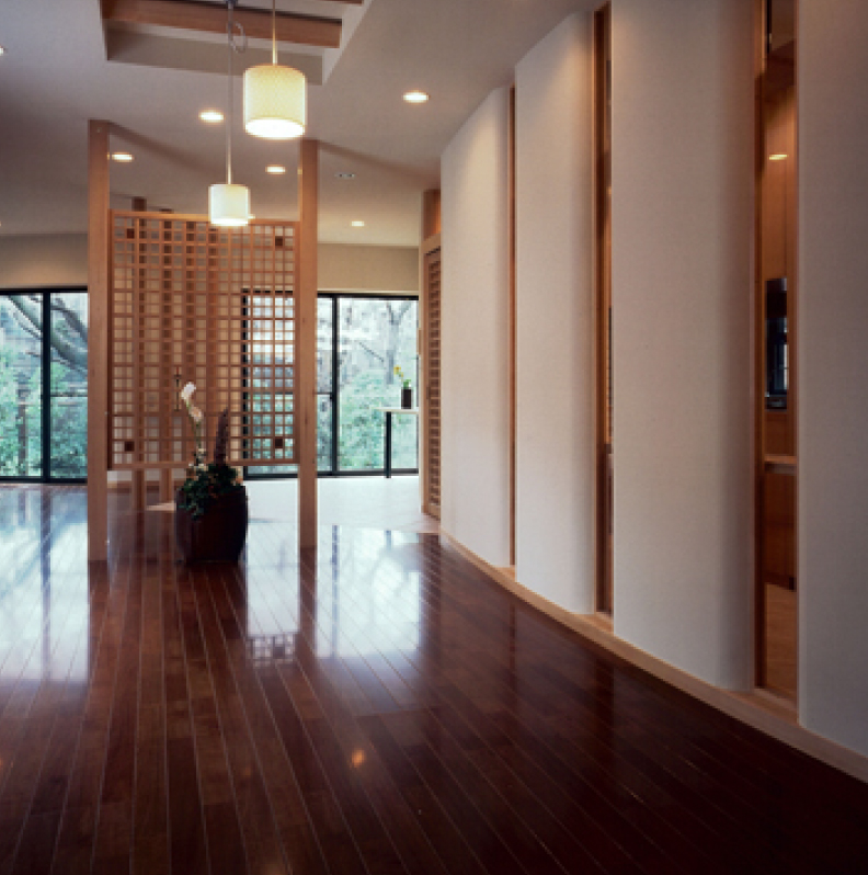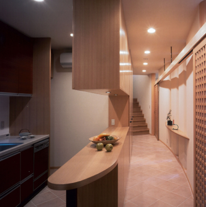 江戸期から風光の地として名高かった滝野川。今も春には満開の桜が人々の目を楽しませています。当建物はその地の伝統を表現する上品な木造建築でありながら、外断熱工法により高気密、高断熱を実現。室内も効率のよい床暖房を採用するなど最新設備によるエコ住宅です。柔らかな曲線を多用した室内間仕切りも住まう人に安らぎを与えます。