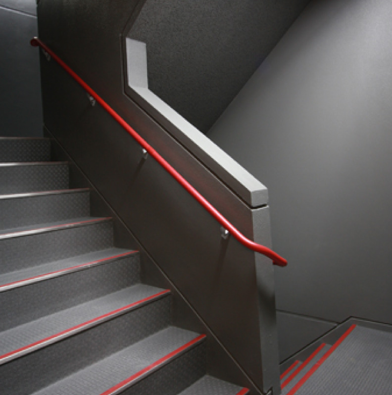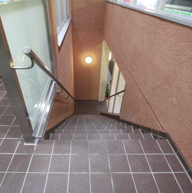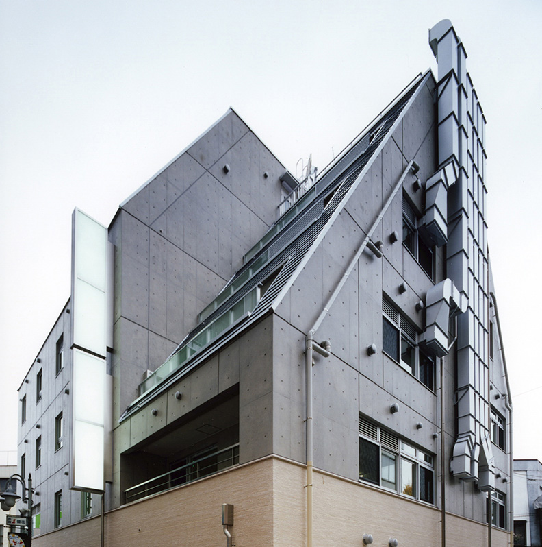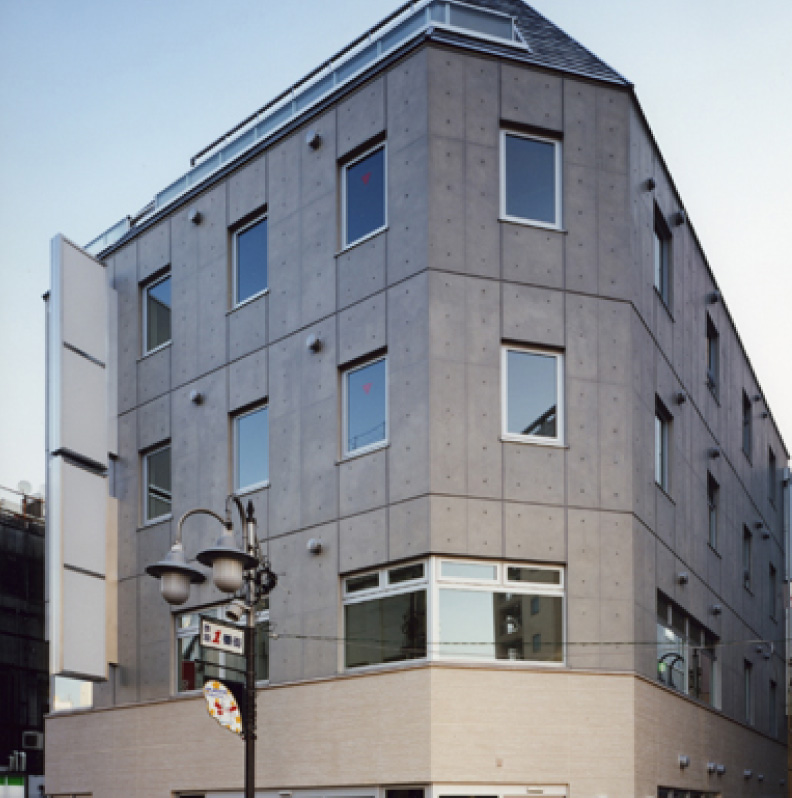 当建物は、道路斜線が厳しく、5階からセットバックしています。この部分をメタリックシルバーの屋根材で覆い、コンクリート打放し仕上げで全体を構成しました。2階下部までを隣接したTスクエアビルと同じ石調タイル仕様とすることで、2つのビルに一体感を持たせています。