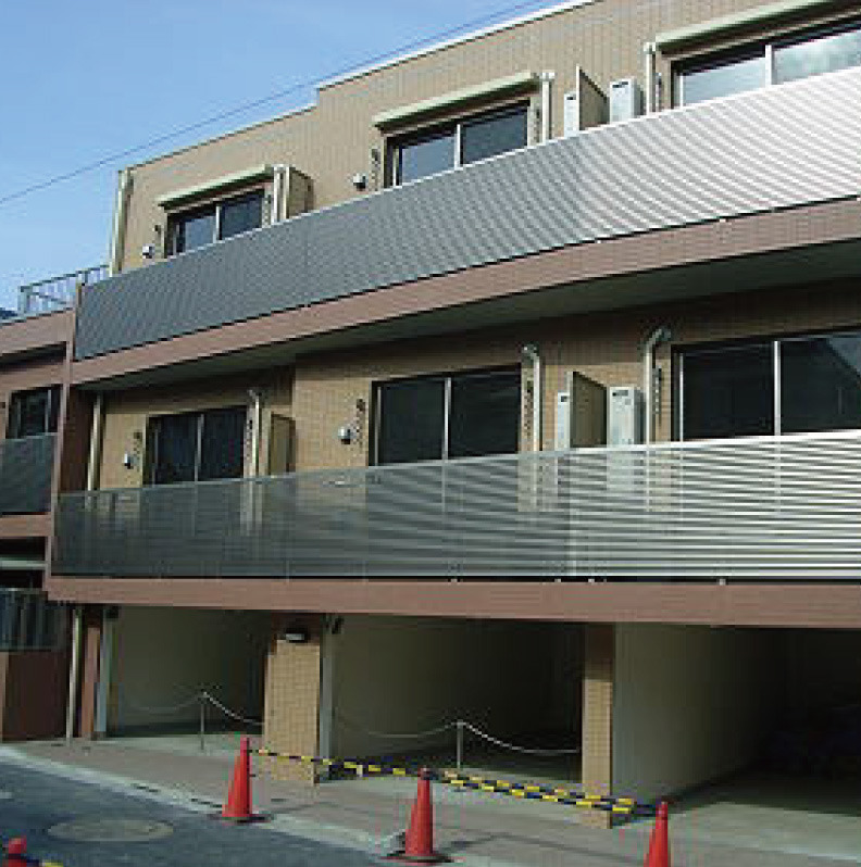 都内の住宅密集地での設計は、斜線制限、日影規制との戦いといってもよいかもしれません。この建物も1階部分の一部を車庫として階高を抑える一方、建物の形状を半階分ずらしたスキップフロアを採用、設計と施工の綿密な打ち合わせにより、戸数を確保しています。