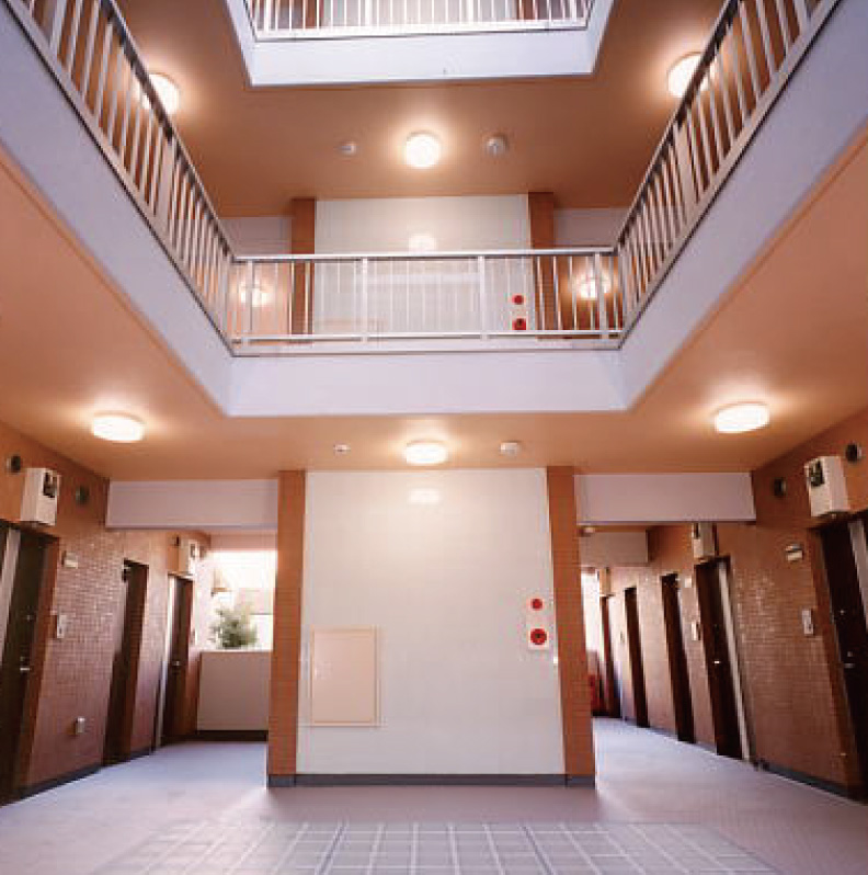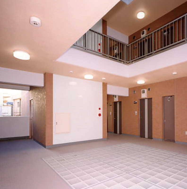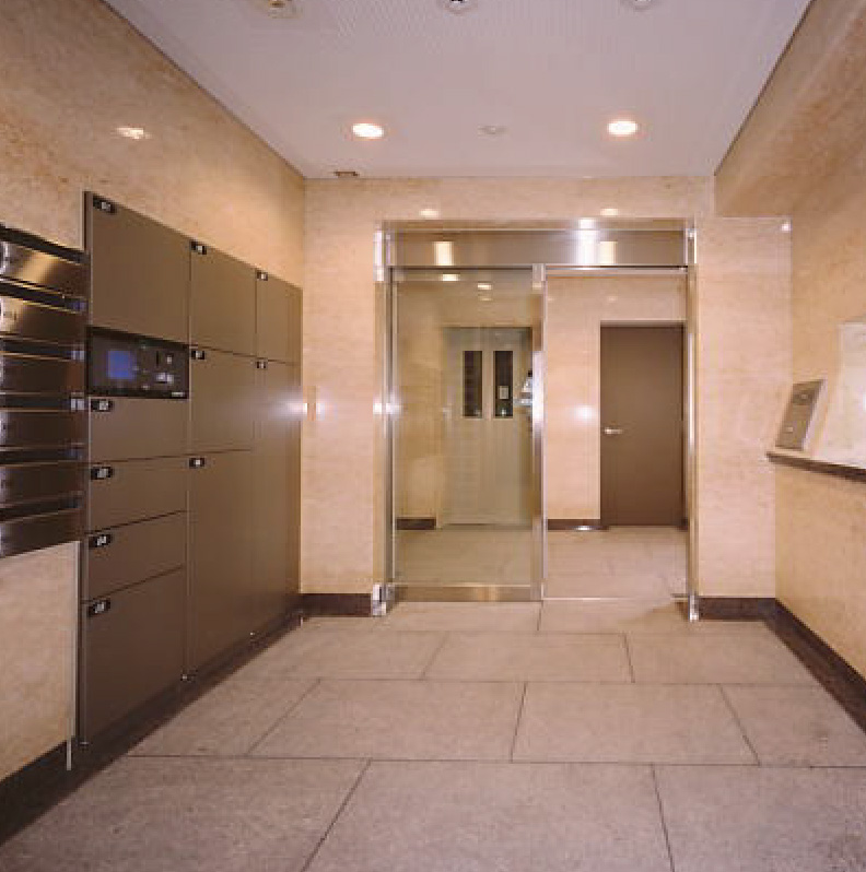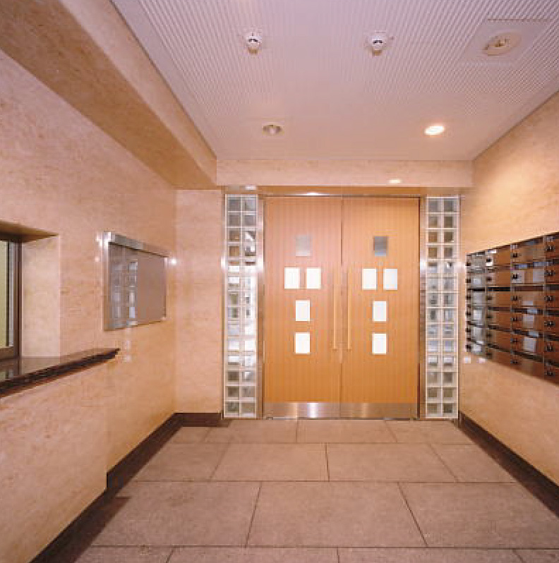 大理石を基調とした重厚なエントランスで、王子権現坂という江戸以来の歴史ある立地を表現する一方、前後道路に接する敷地形状を利用し、内部を中庭式の贅沢で明るい吹き抜け空間としたハイグレードなマンションです。