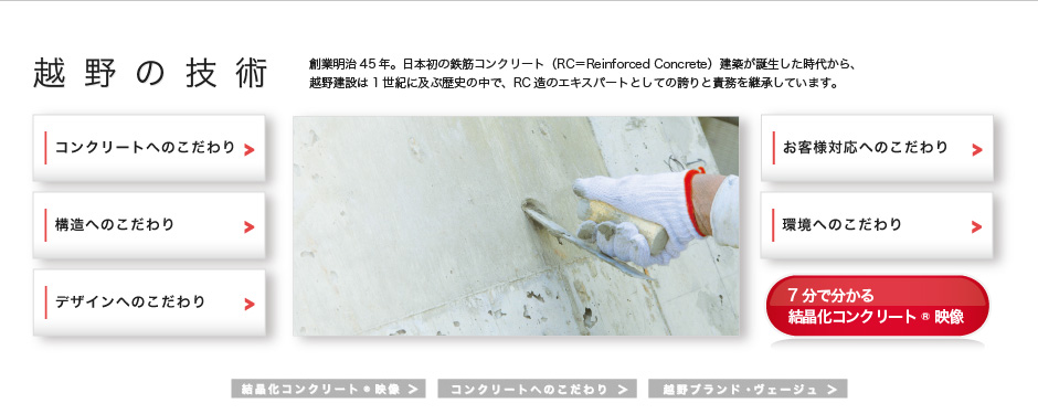 創業明治45年。日本初の鉄筋コンクリート(RC=Reinforced Concrete)建築が誕生した時代から、越野建設は1世紀に及ぶ歴史の中で、RC造のエキスパートとしての誇りと責務を継承しています。